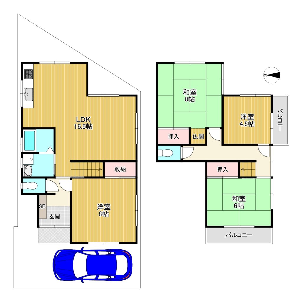 4LDKの間取りは、夫婦と子ども2〜3人のご家族や、テレワーク用の書斎が欲しい方にも対応できる広さです。図面を見ると1階にLDK(16.5帖)と洋室(8帖)・和室があり、2階には洋室(4.5帖)・和室(6帖)・バルコニー付きの部屋が配置されています。