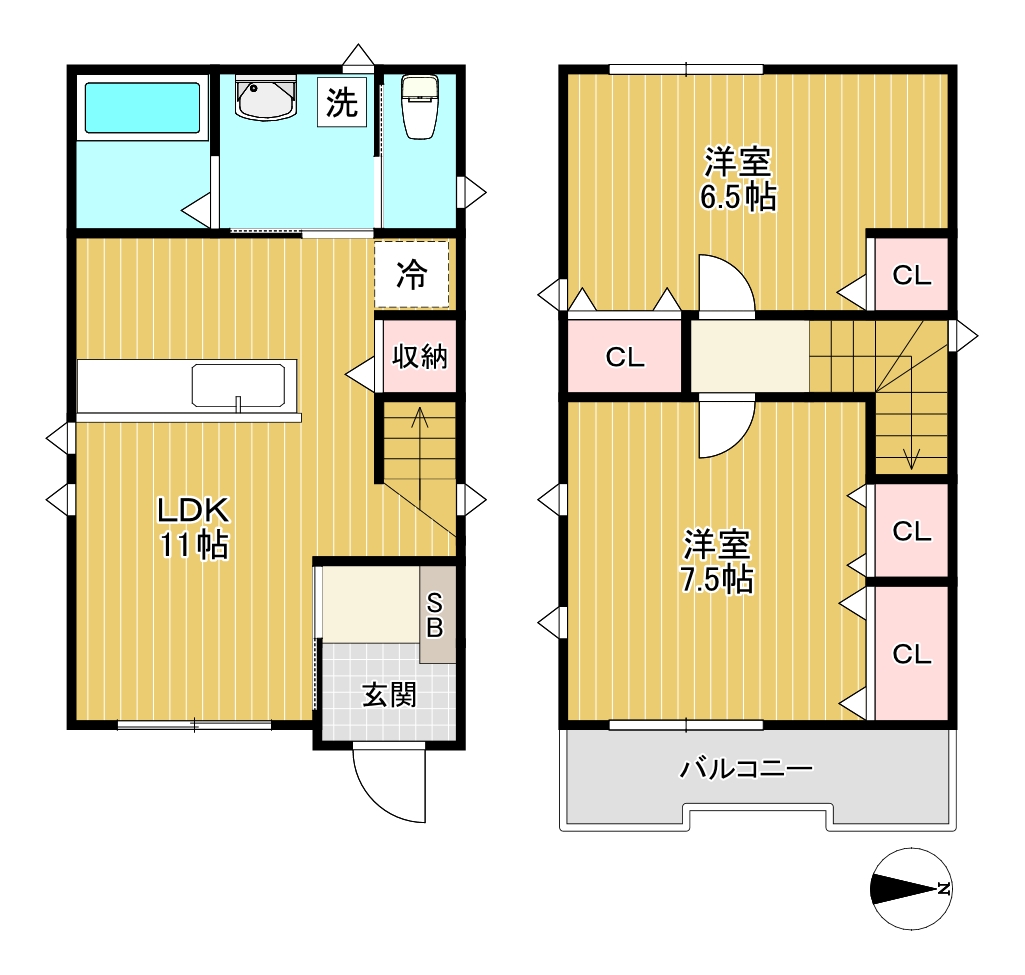 2階:洋室6.5畳+洋室7.5畳+バルコニー