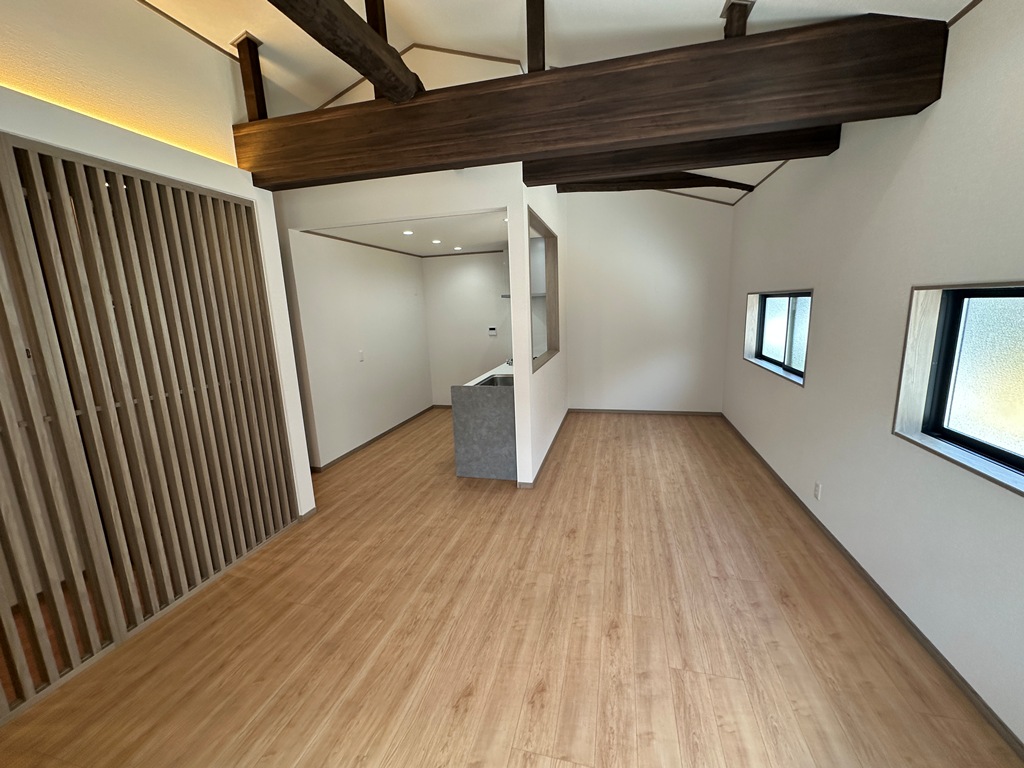 物件写真からも分かるとおり、室内はスタイリッシュなフローリングが全室に採用されており、清潔感と高級感が両立したインテリアとなっています。木目調のアクセントウォールやスリット状のデザインパネルなど、細部にまでこだわったリノベーションが施されており、住む人のセンスをさりげなく引き立ててくれます。